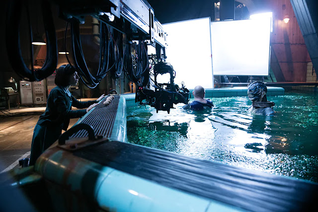 L’amore tra Elisa e la creatura è un amore che pare appartenere al periodo muto del cinema. Nessuno dei due parla, la loro comunicazione avviene unicamente attraverso il corpo, il linguaggio dei segni (con Elisa che prova a spiegarne al mostro i simboli) e, soprattutto, è perennemente accompagnata da musica orchestrale, come accadeva nei primi anni del cinematografo. Il loro è infatti anche un amore da musical, un amore poetico e drammatico, che si propaga su una colonna sonora onnipresente, sia omodiegetica, fatta di vinili e musical trasmessi in televisione, ma anche extra diegetica, la colonna sonora premio oscar di Alexandre Desplat che segue tutti i momenti intimi della coppia, dal primo rapporto sessuale (La Javanaise di Madeleine Peyroux) al bacio sommerso (Overflow of Love scritta dallo stesso Desplat), dove l’acqua con cui Elisa riempie la stanza perché possa avvolgere lei e la creatura cola dall’appartamento fin dentro al cinema.
