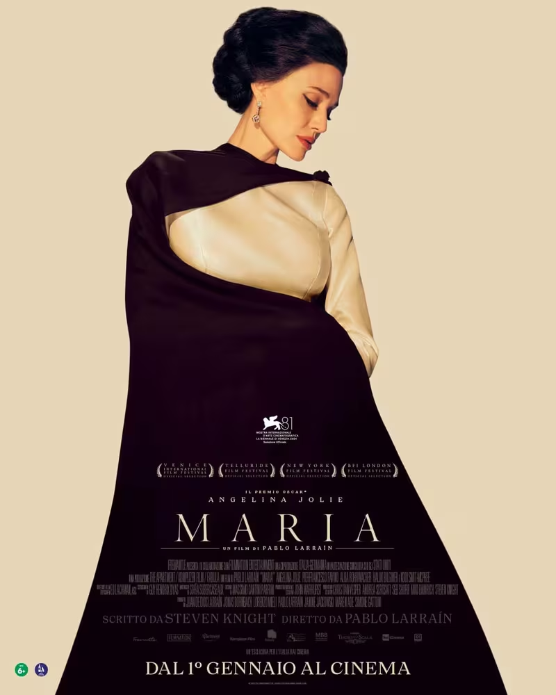 Nel cast di Maria, Angelina Jolie nei panni della immortale Callas, affiancata da Kodi Smit-McPhee e dai nostrani Pierfrancesco Favino e Alba Rohrwacher. Maria debutterà per il mercato nordamericano dall’11 dicembre in esclusiva su Netflix, in Italia dal 1 gennaio 2025 al cinema con 01 Distribution.