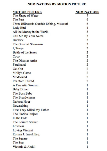 Mentre il film di Guillermo Del Toro ha infatti il monopolio con 7 nomination, la serie di HBO domina tra le serie tv con 6, il massimo che si possa totalizzare per il settore. The Shape of Water è seguito da The Post di Steven Spielberg, con 6 nomination, a pari merito con Tre manifesti a Ebbing, Missouri. Seguono con 3 nomination, Chiamami col tuo nome, I, Tonya, Tutti i soldi del mondo, Dunkirk e The Greatest Showman.